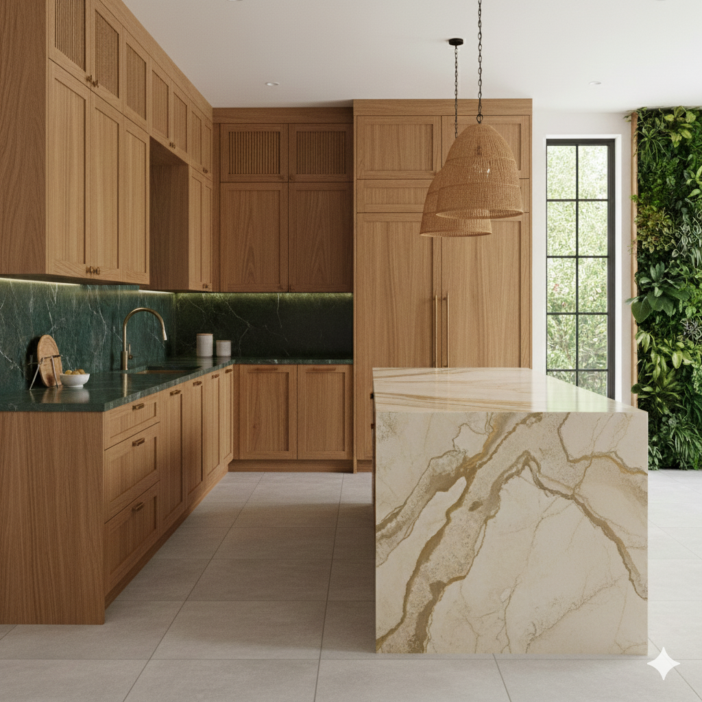 These movement-focused slabs give kitchens a unique look that cannot be replicated by engineered materials. Many homeowners choose them for islands while keeping the perimeter more subtle.