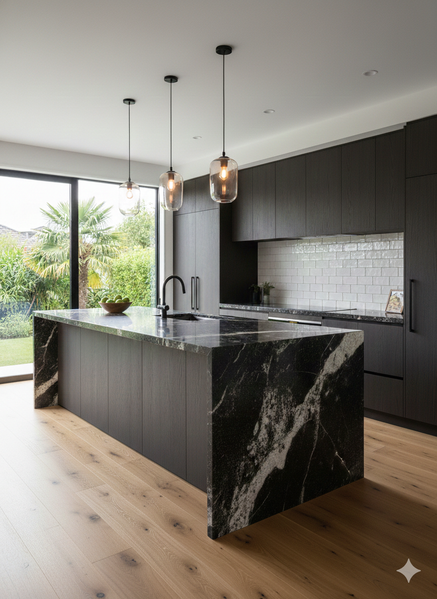 Beyond aesthetics, Maori Black is an exceptionally practical kitchen surface. Granite is one of the hardest natural stones used in countertop applications, making it resistant to the daily demands of cooking: chopping, hot pots and pans, and heavy use. A kitchen island in Maori Black granite paired with waterfall edges becomes the focal point of an entire open-concept living space.